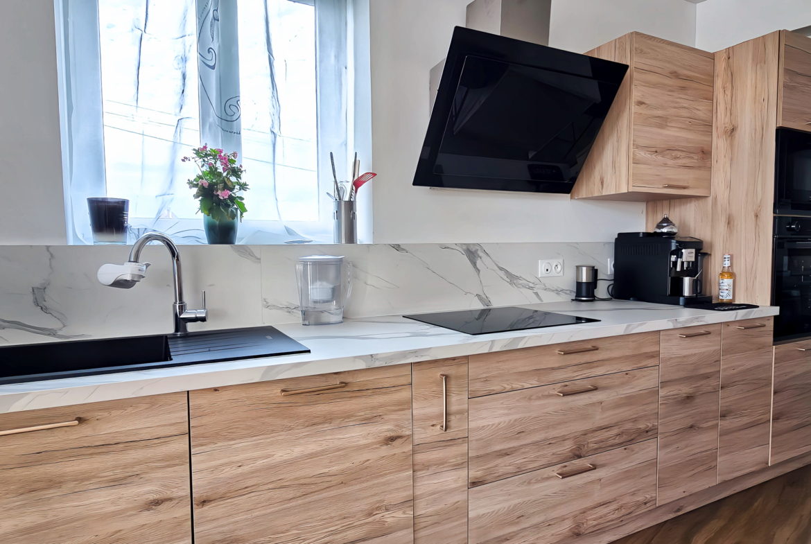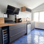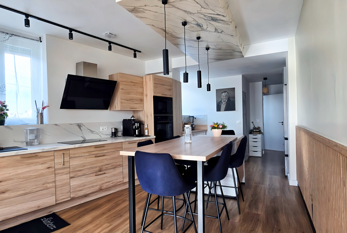 La cuisine équipée, avec son îlot central sur mesure, s’intègre parfaitement à l’espace, idéale pour partager un café ou un dîner entre amis.