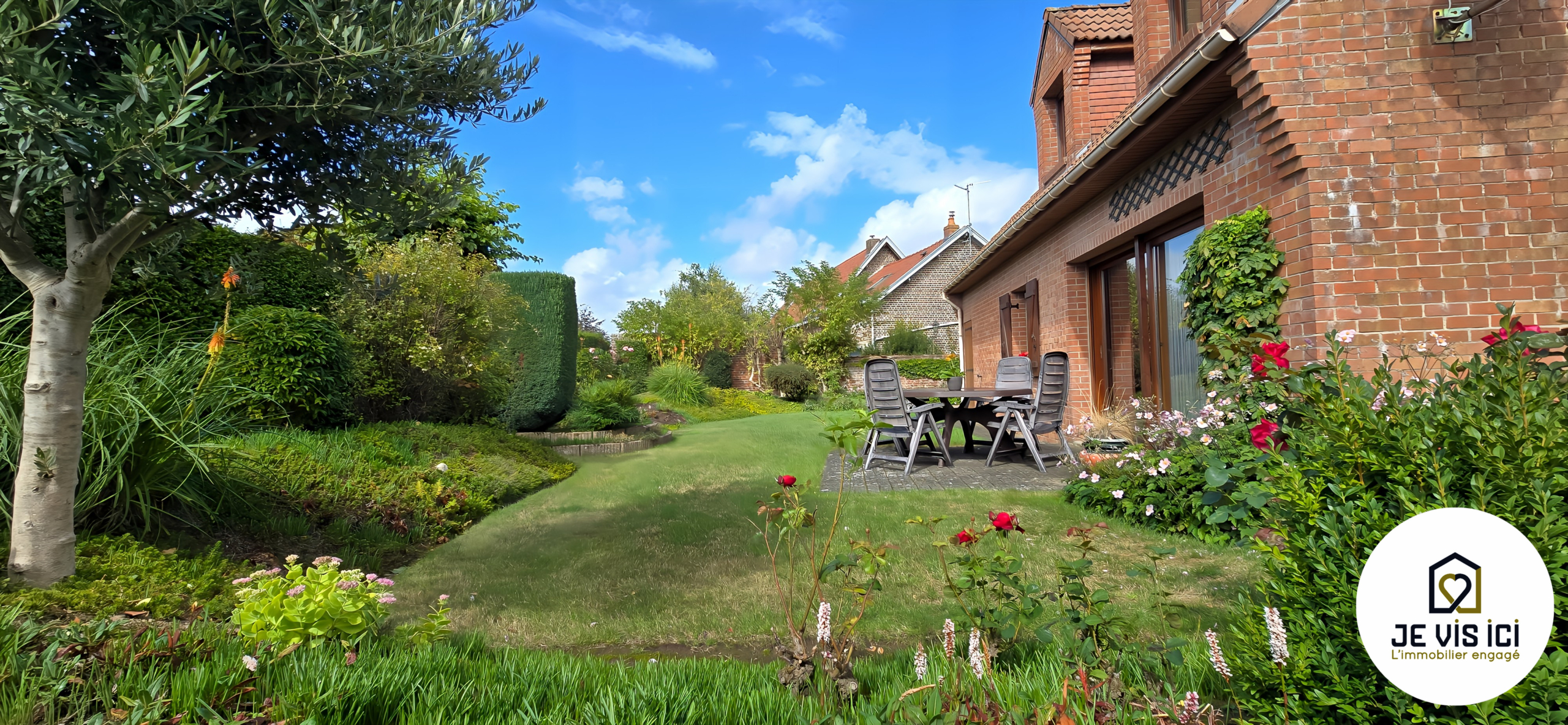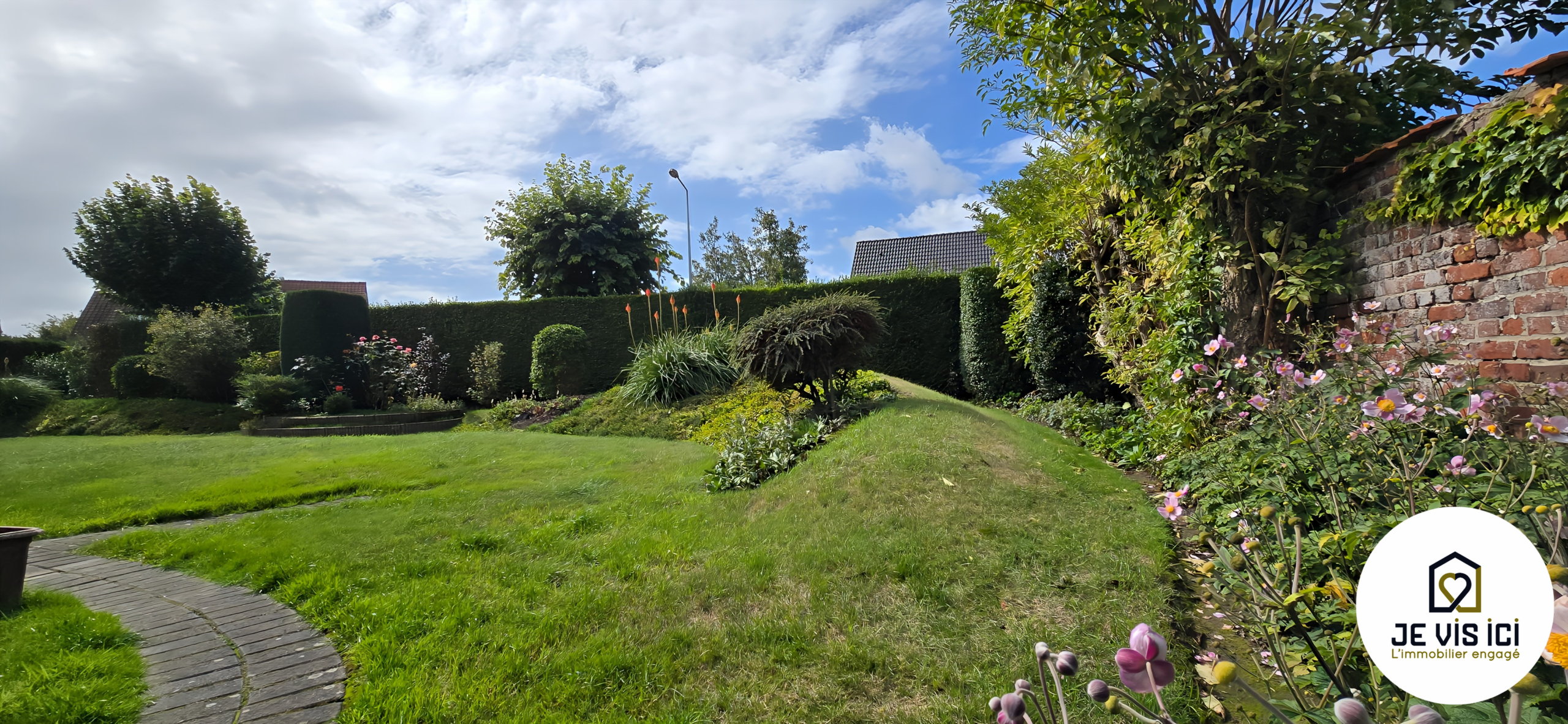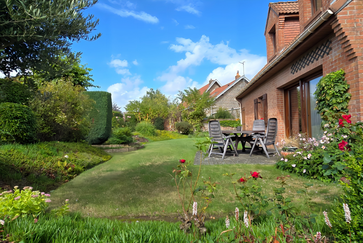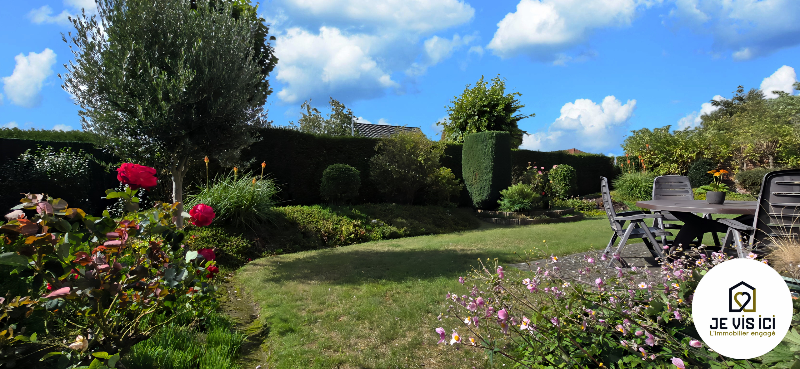 À l’extérieur, les amoureux du jardinage ou simplement des beaux extérieurs seront comblés : massifs fleuris, pelouse entretenue, grande terrasse carrelée et chalet de jardin composent un décor soigné, reflet de l’attention portée à chaque détail.