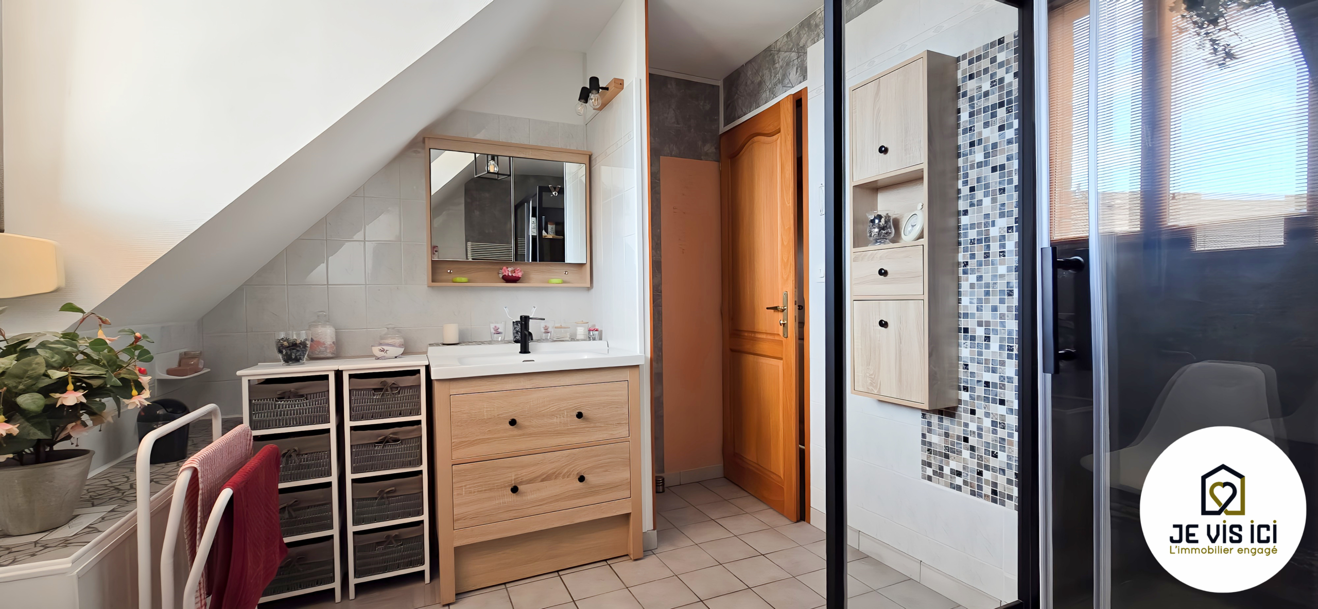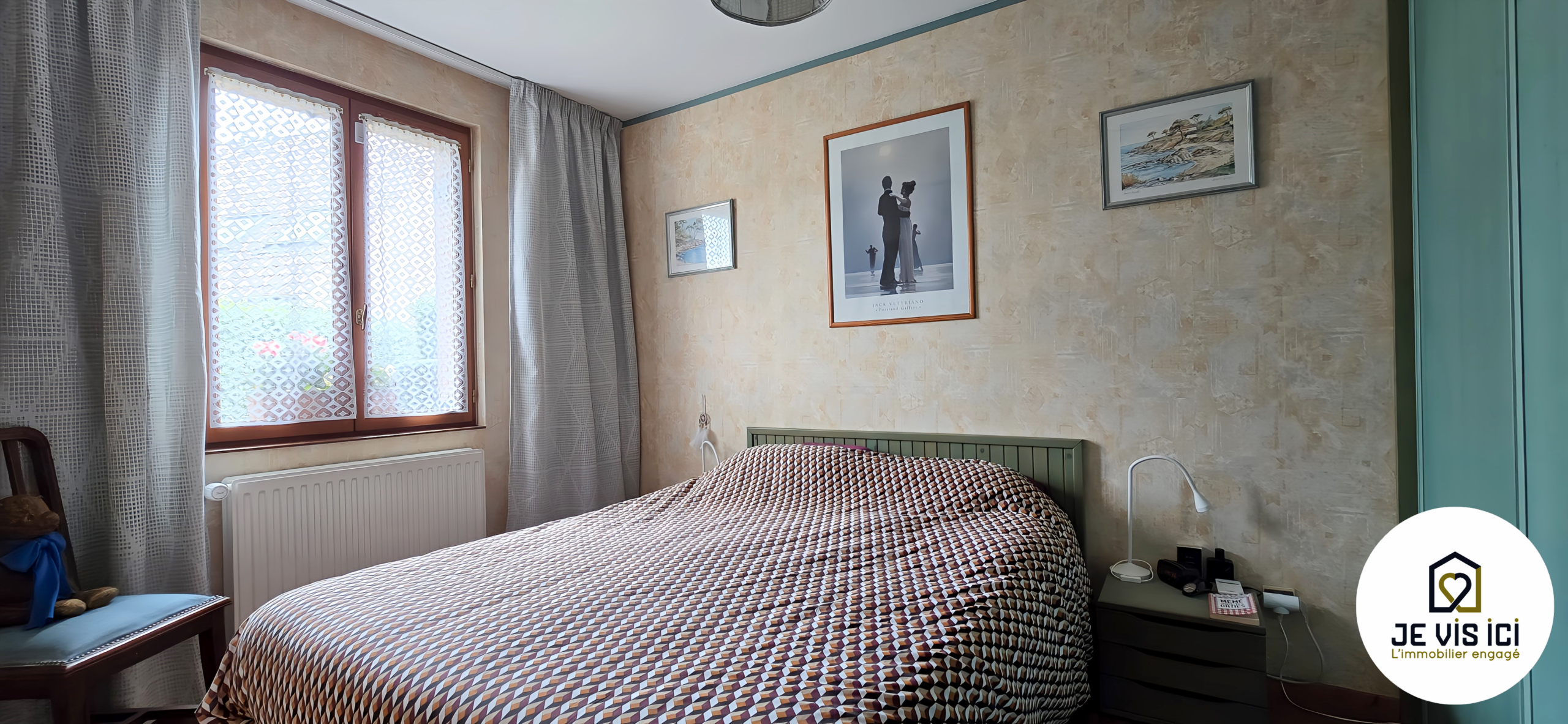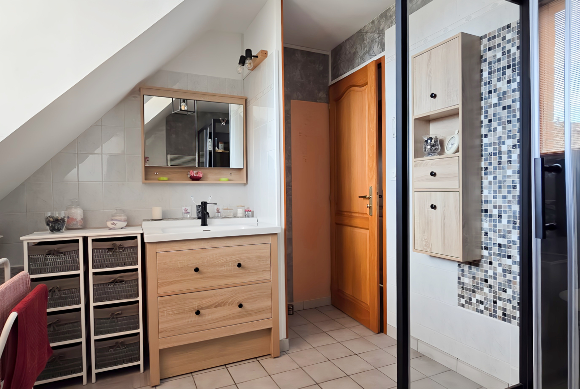 La chambre au rez-de-chaussée apporte un vrai confort au quotidien : parfaite pour recevoir, télétravailler ou préparer l’avenir en toute sérénité.