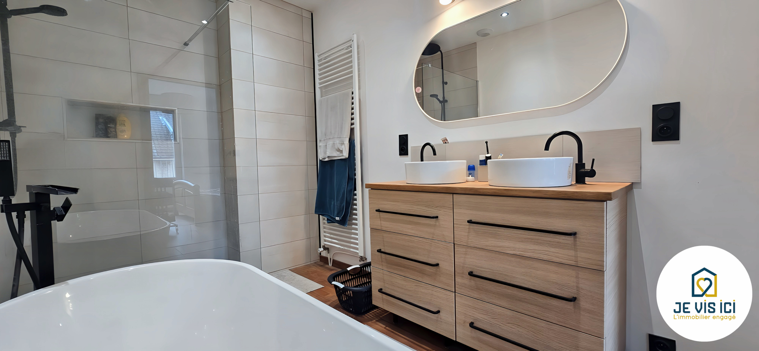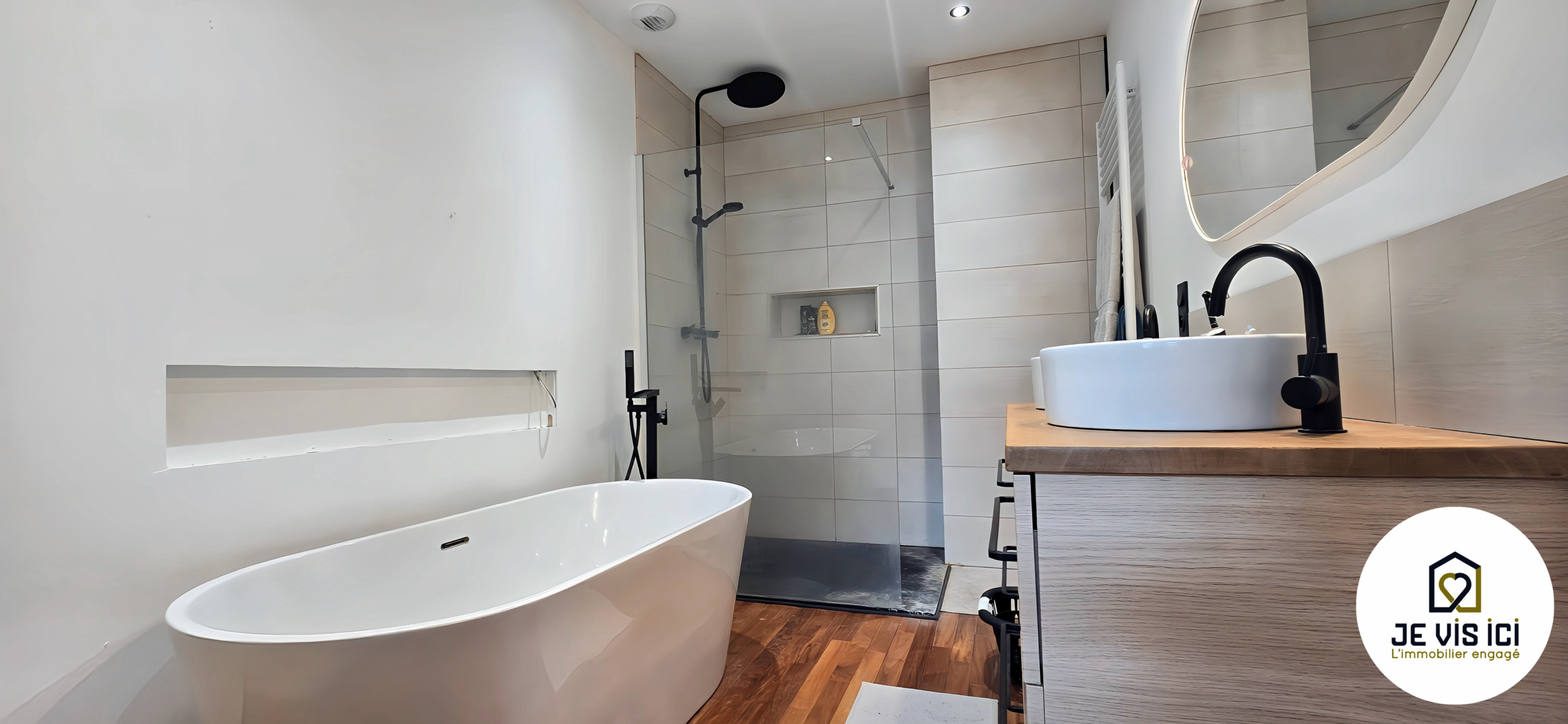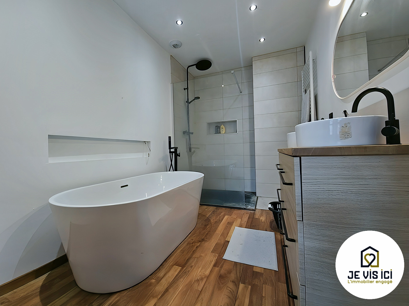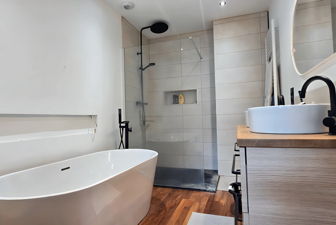 Baignoire îlot, douche italienne, meuble vasque : un espace élégant et confortable.
