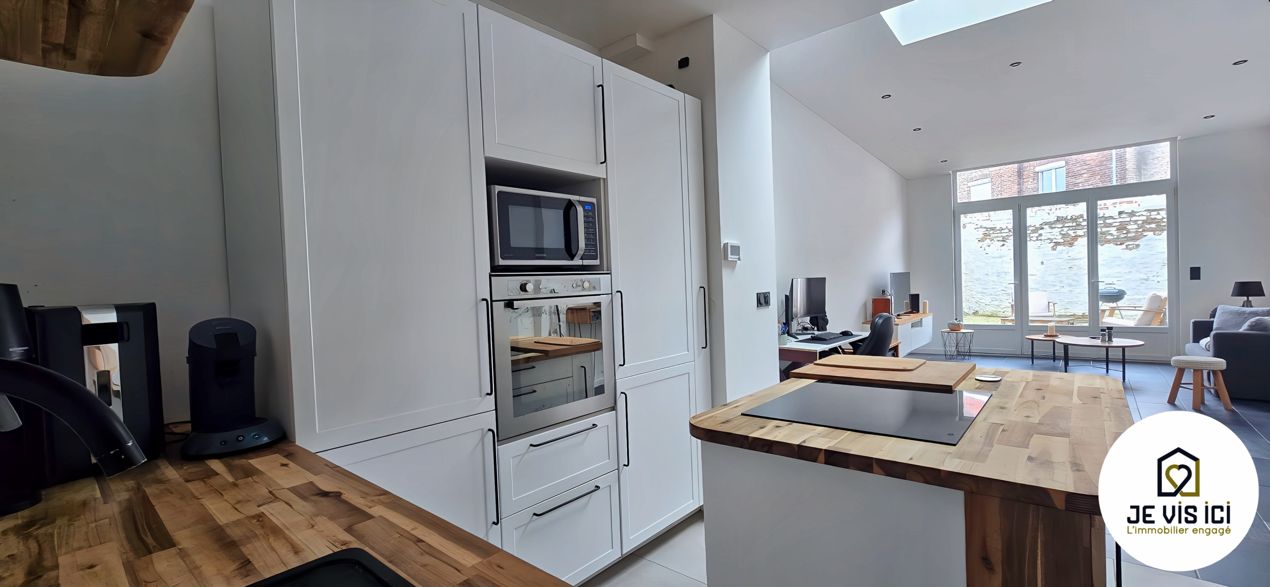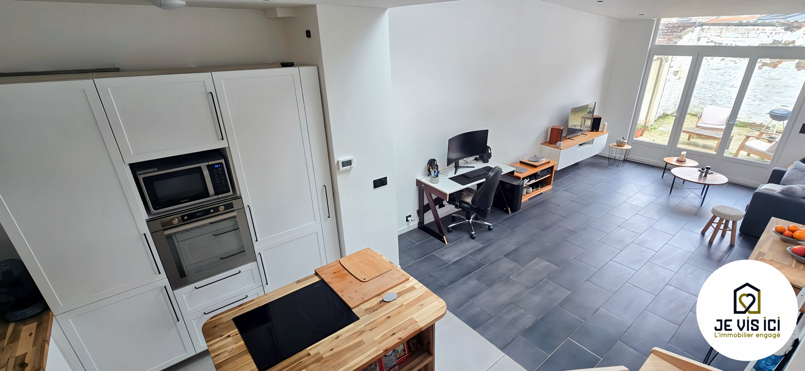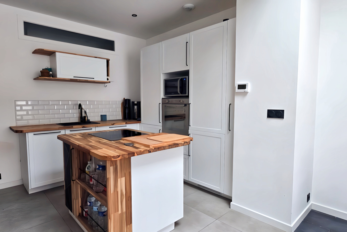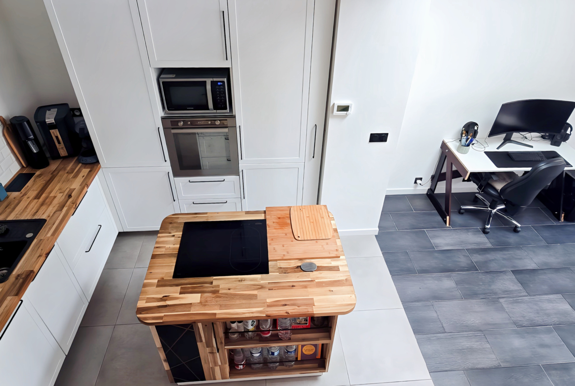 La pièce de vie s’articule autour d’une cuisine US équipée, moderne et fonctionnelle, ouverte sur le séjour et tournée vers l’extérieur grâce à une large baie vitrée donnant sur la cour.