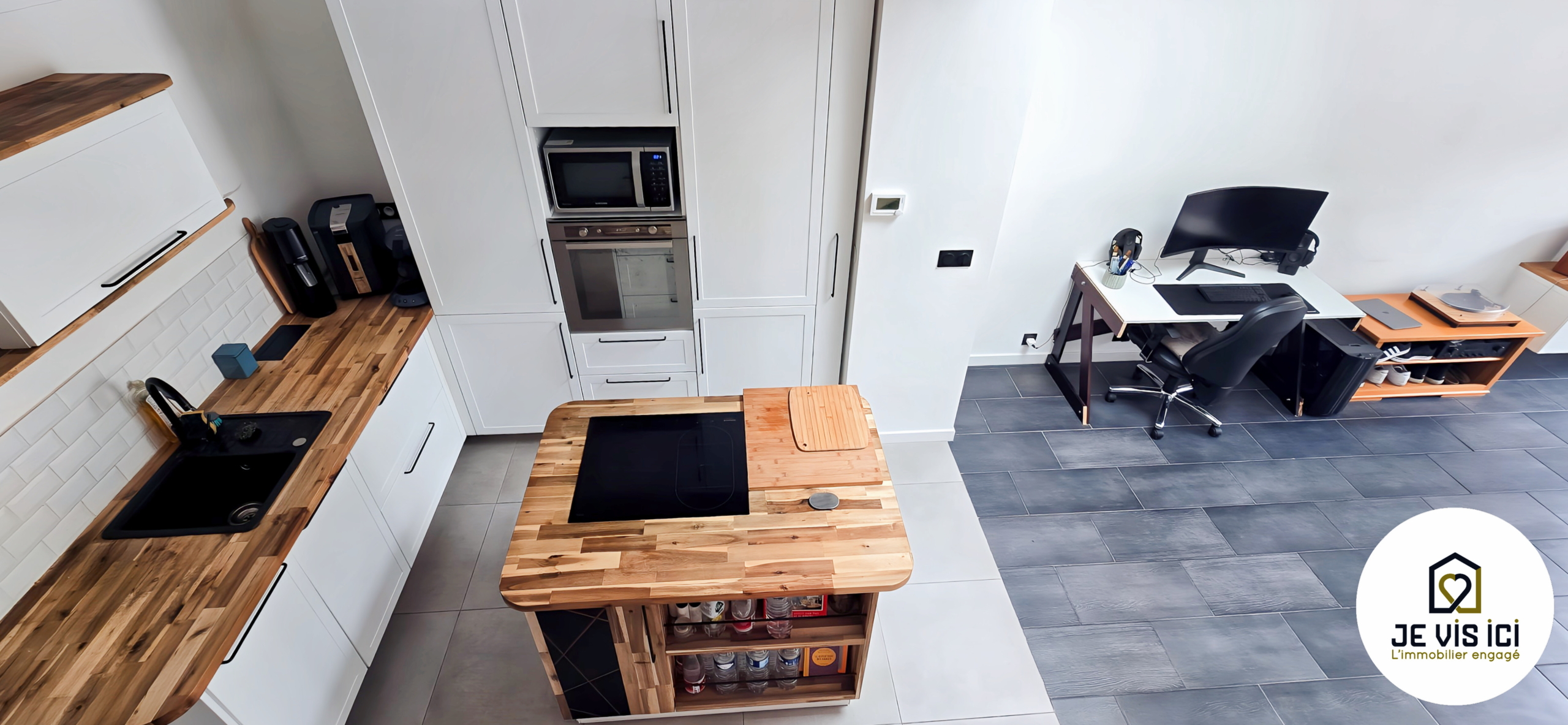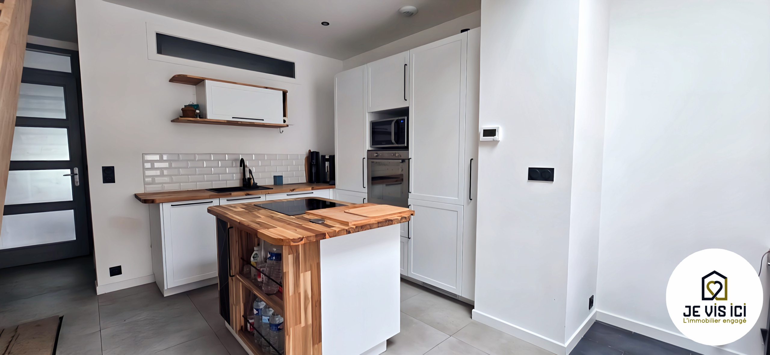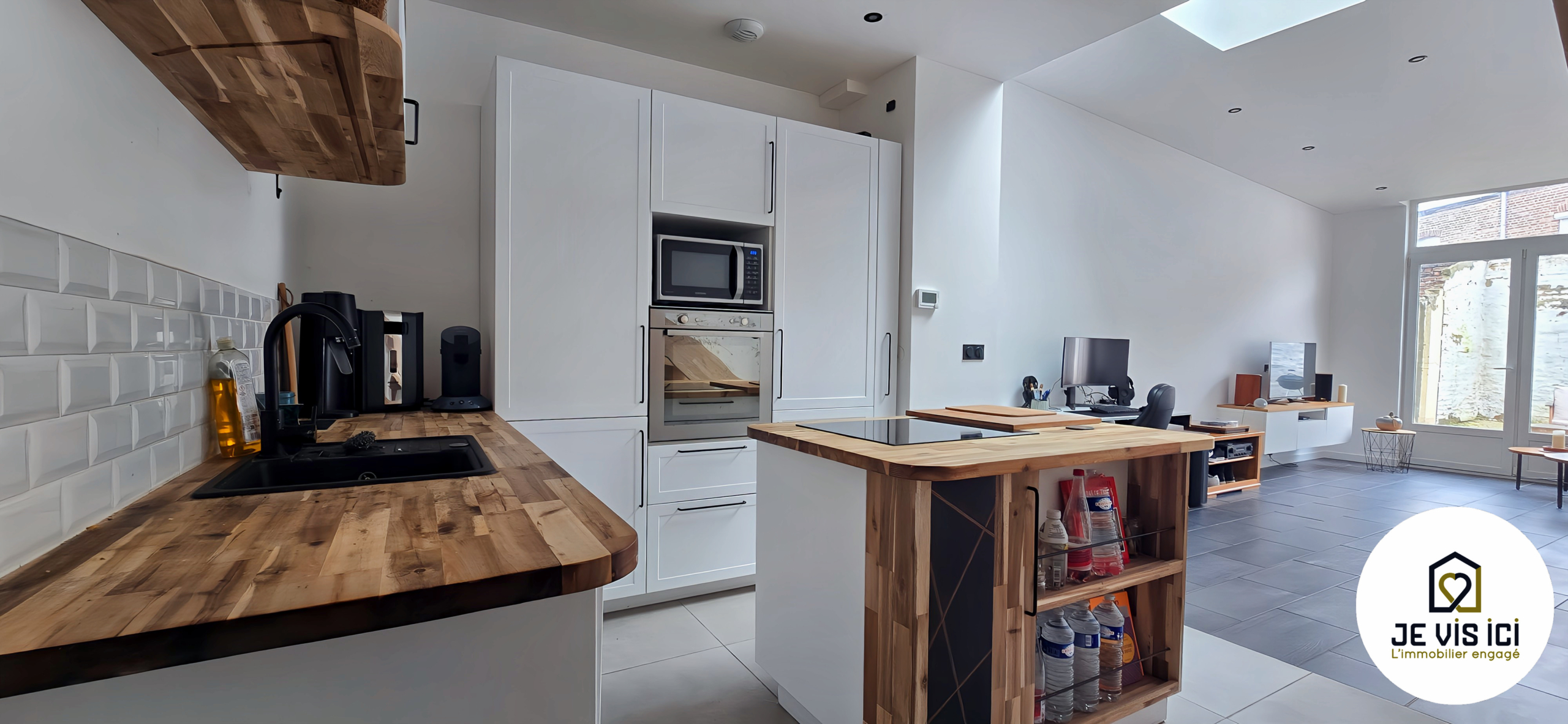 La pièce de vie s’articule autour d’une cuisine US équipée, moderne et fonctionnelle, ouverte sur le séjour et tournée vers l’extérieur grâce à une large baie vitrée donnant sur la cour.